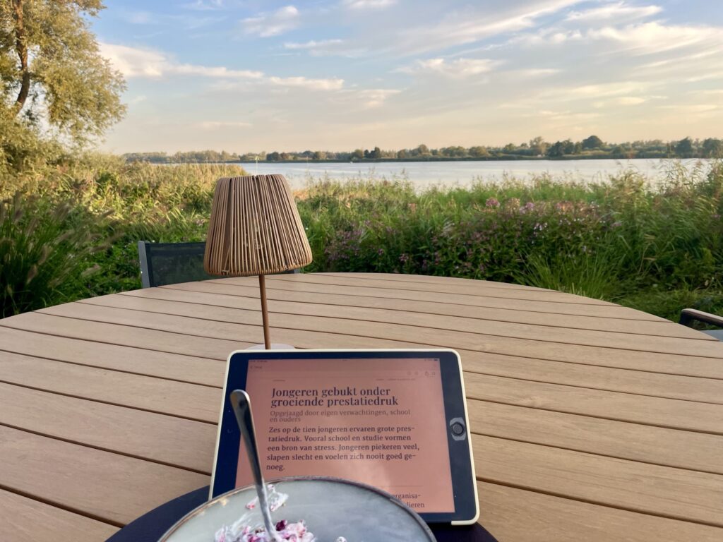 Natuurlijk ga je bij aankomst eerst het adembenemende uitzicht checken. Het Ibiesa-terras ligt pal aan de Amer met uitzicht op de Biesbosch, vanaf hier geniet je in het zonnetje van de bootjes die voorbij varen. Mocht het iets minder weer zijn, dan zit je binnen ook heerlijk aan de ruime eettafel en kun je genieten van hetzelfde uitzicht.
