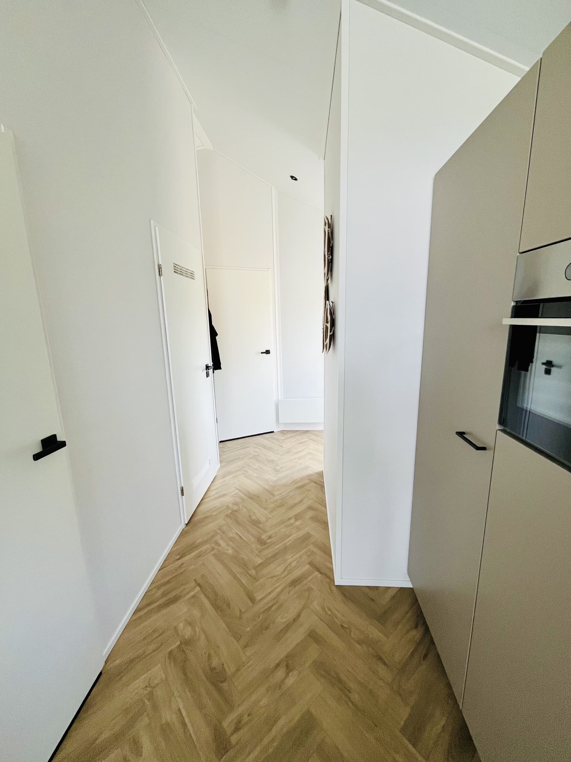 De ruime hoekkeuken is voorzien van een vierpits inductiekookplaat, een koelkast met vriesvak, een combi-oven en een vaatwasser.